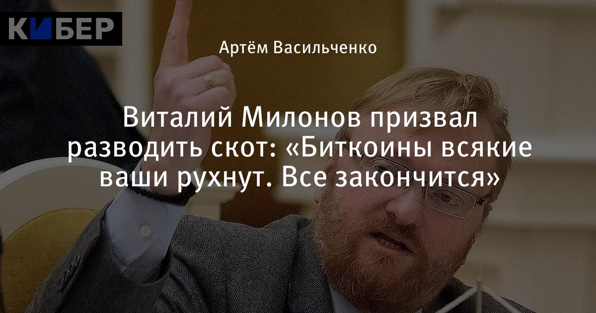 «Это все рухнет, цифровые всякие ваши биткоины, все закончится. Люди потеряют огромное состояние [...] », – считает депутат Виталий Милонов. Он призвал общество разводить скот, отметив, что у людей с корой будет «молочко и творожок».