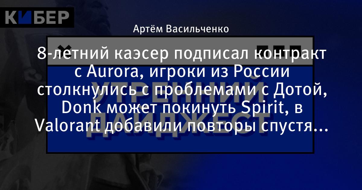 8-летний каэсер подписал контракт с Aurora, игроки из России столкнулись с проблемами с Дотой, Donk может покинуть Spirit, в Valorant добавили повторы спустя 5 лет после релиза и другие новости утра