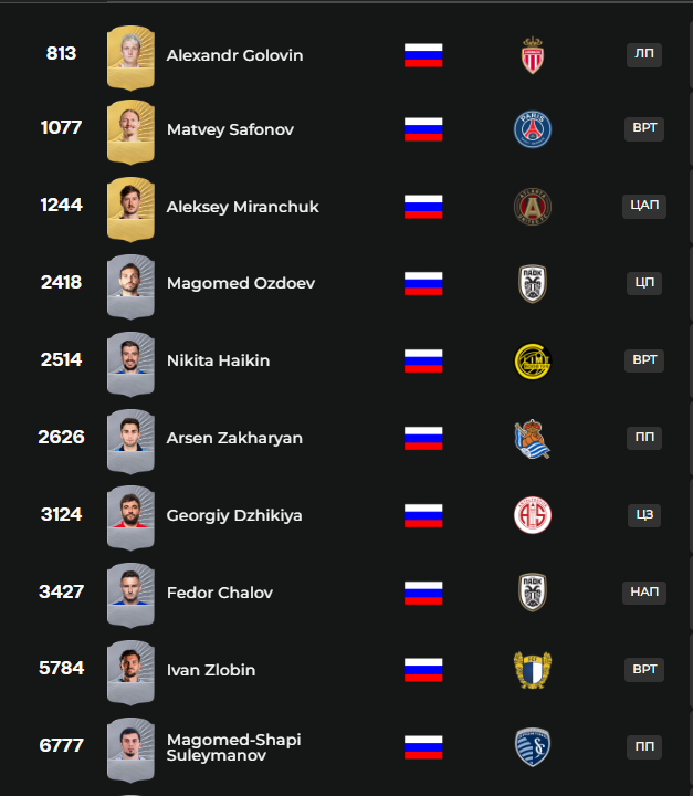 Александр Головин, Матвей Сафонов и Алексей Миранчук лидируют в рейтинге лучших российских футболистов в игре EA FC 26. У них золотые карточки.