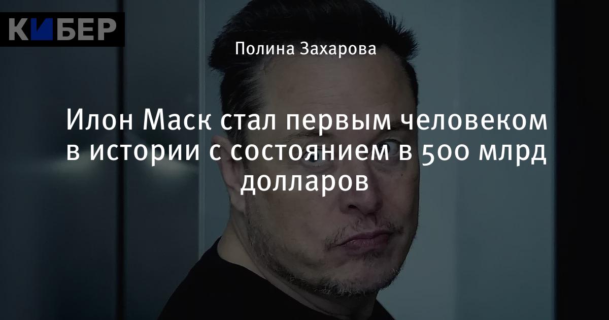 Илон Маск официально стал первым человеком в истории, чье состояние оценивается в 500 млрд долларов. В декабре прошлого года он стал первым человеком с состоянием в 400 млрд долларов.