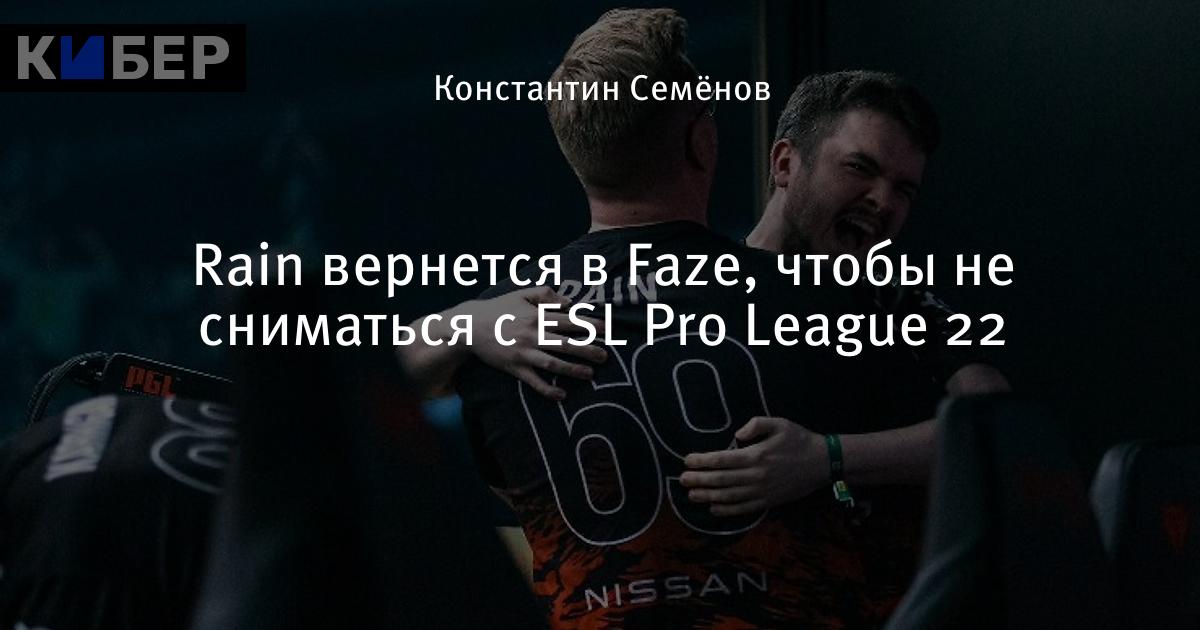 Хаваард «Rain» Найгард доиграет за Faze ESL Pro League 22, где команда получила техническое поражение в первом матче из-за перебора замен – от ростера, который был приглашен на турнир в июле, осталось 2 игрока: Финн «Karrigan» Андерсен и Давид «Frozen» Чернянский.