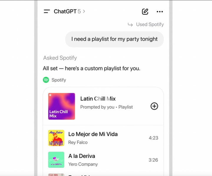 В рамках презентации нововведения разработчики сделали запрос «Составь плейлист для вечеринки», а затем, после текстового плейлиста, ChatGPT предложил подключить Spotify и сделал подборку на основе предпочтений пользователя.