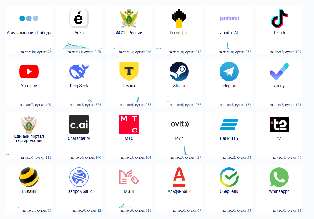 Среди сервисов и приложений утром, 14 октября, массовые сбои наблюдаются в работе Авиакомпании «Победа» и ФССП России.