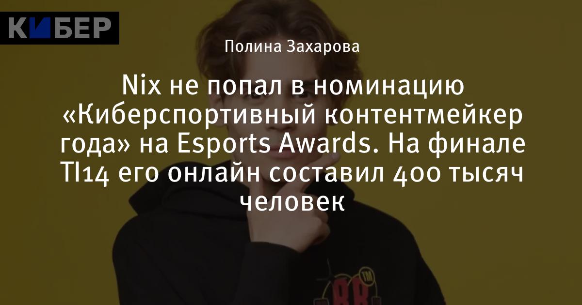 Nix не попал в номинацию «Киберспортивный контентмейкер года» на Esports Awards. На финале TI14 его онлайн составил 400 тысяч человек