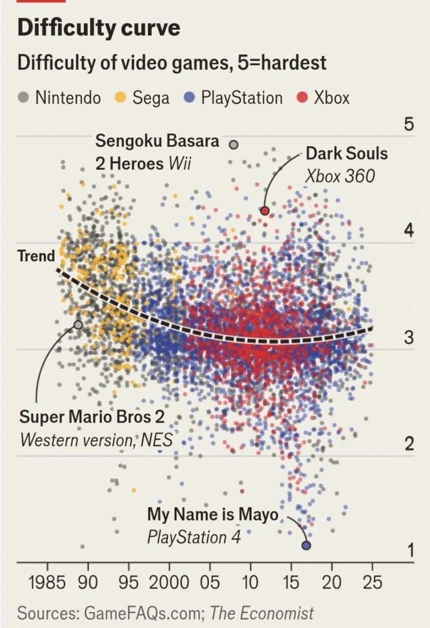 Данные GameFAQs доказывают, что со временем, особенно после 1990-х, игры стали проще, но с 2010 года уровень сложности остается стабильным.