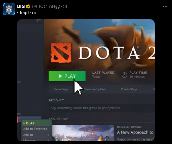 «S1mple прямо сейчас», – написала BIG в своих социальных сетях, прикрепив скриншот с запуском Доты.