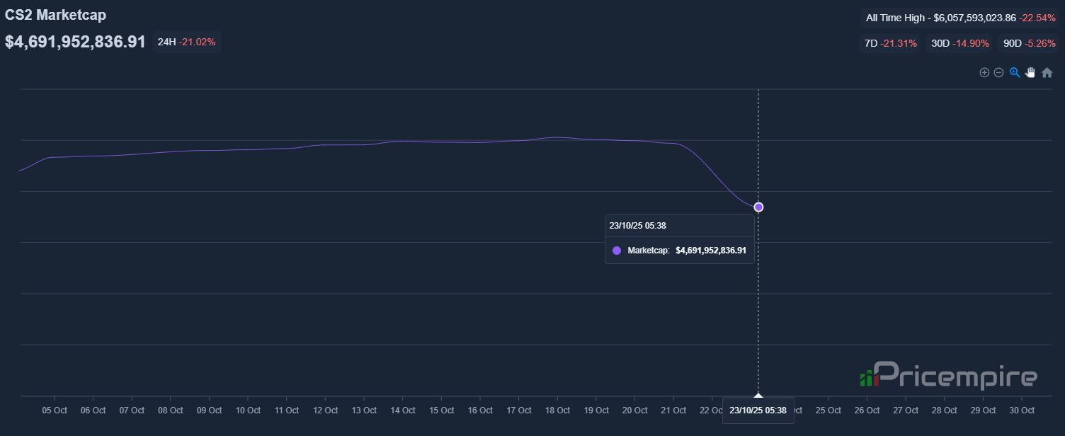 По данным Pricempire, капитализация рынка скинов 21 октября составляла 5,9 млрд долларов. После ночного обновления от 23 октября общая стоимость скинов упала на 1,3 млрд и теперь составляет 4,6 млрд долларов.
