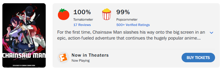 Аниме «Человек-бензопила. Фильм: История Резе» получило 100% «свежести» на Rotten Tomatoes