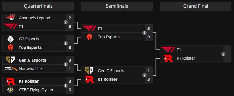 Участники плей-офф: Anyone’s Legend, T1, G2, Top, Gen.G, Hanwha Life, KT Rolster, CTBC Flying Oyster.