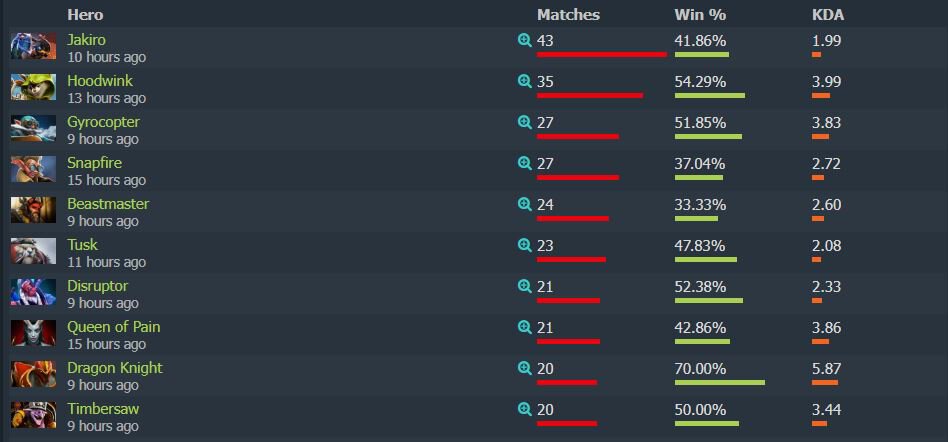Следом по количеству пиков расположились Hoodwink (35 пиков, 54,29% винрейт), Gyrocopter (27, 51,85%) и Snapfire (27, 37,04%).