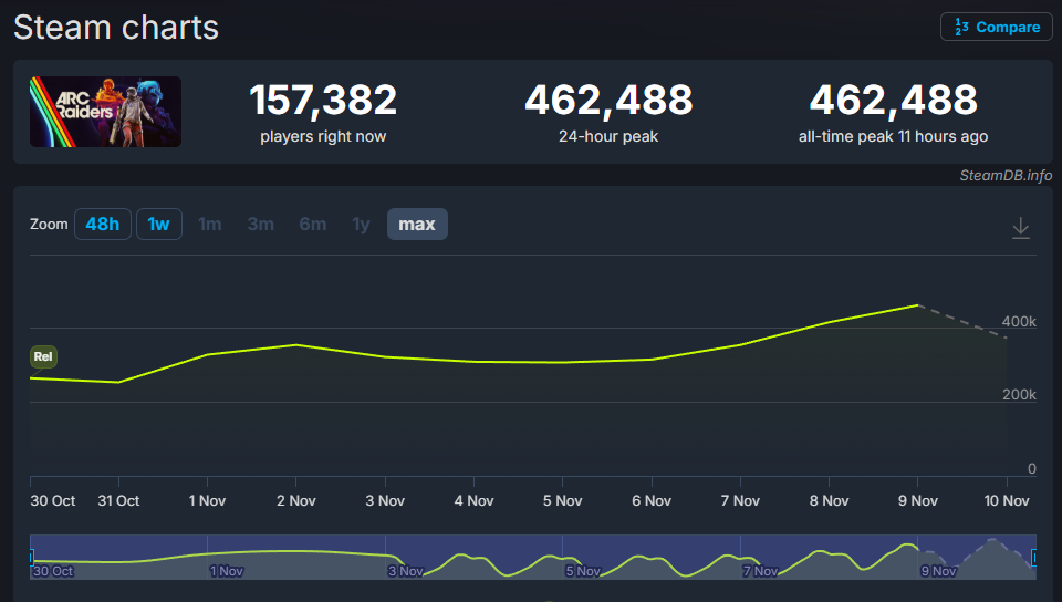 Пиковый онлайн ARC Raiders в Steam превысил 462 тысячи пользователей