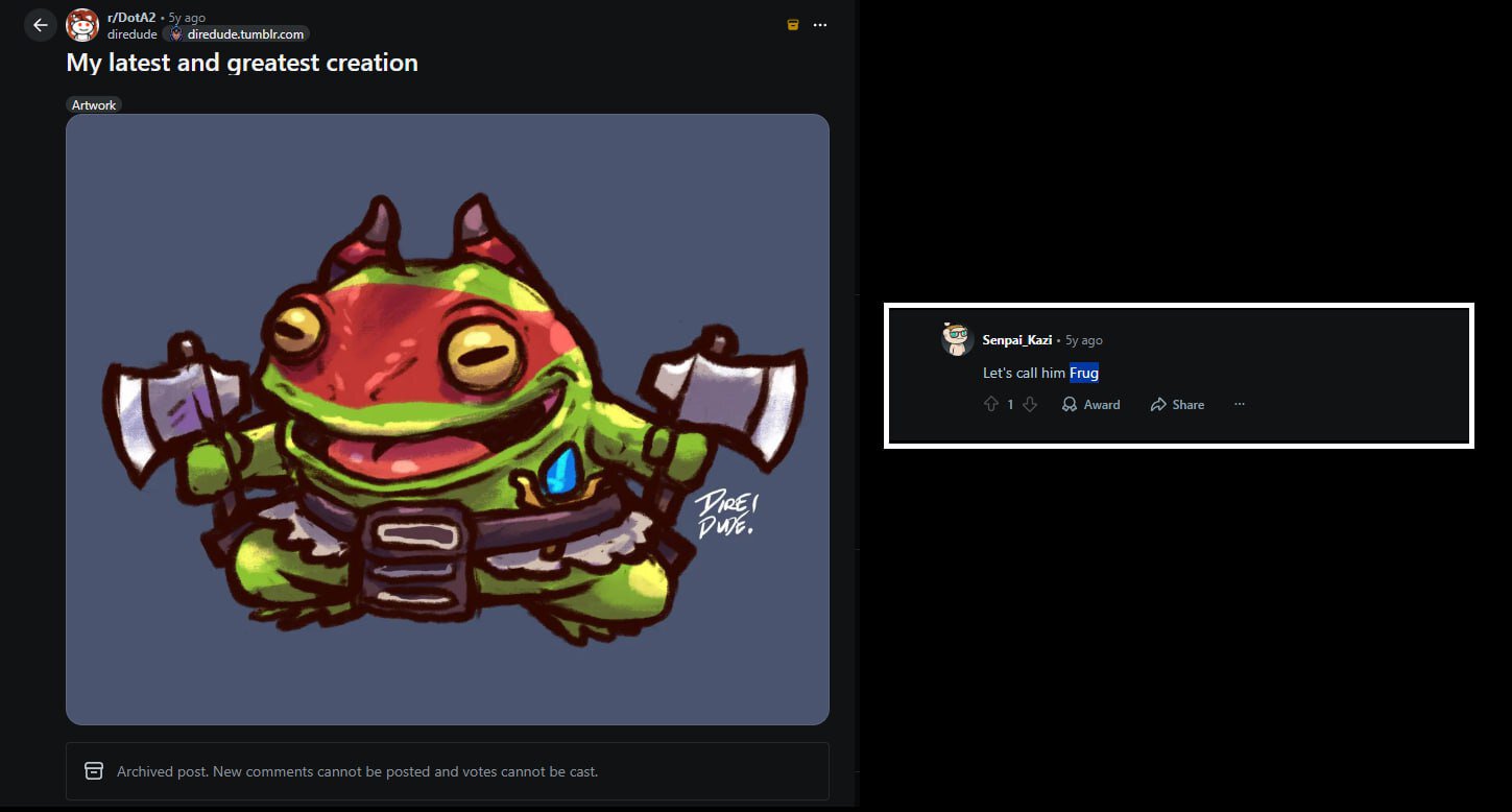 В сентябре на тестовый сервер Доты добавили Лягушку-барда. В августе sikle предположил, что именно Лягушка-бард станет новым героем Доты.