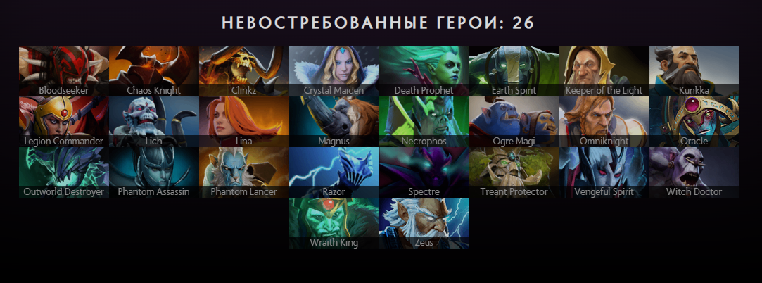 На турнире ни разу не пикнули 26 персонажей, среди которых оказались Oracle, Kunkka и Phantom Lancer.