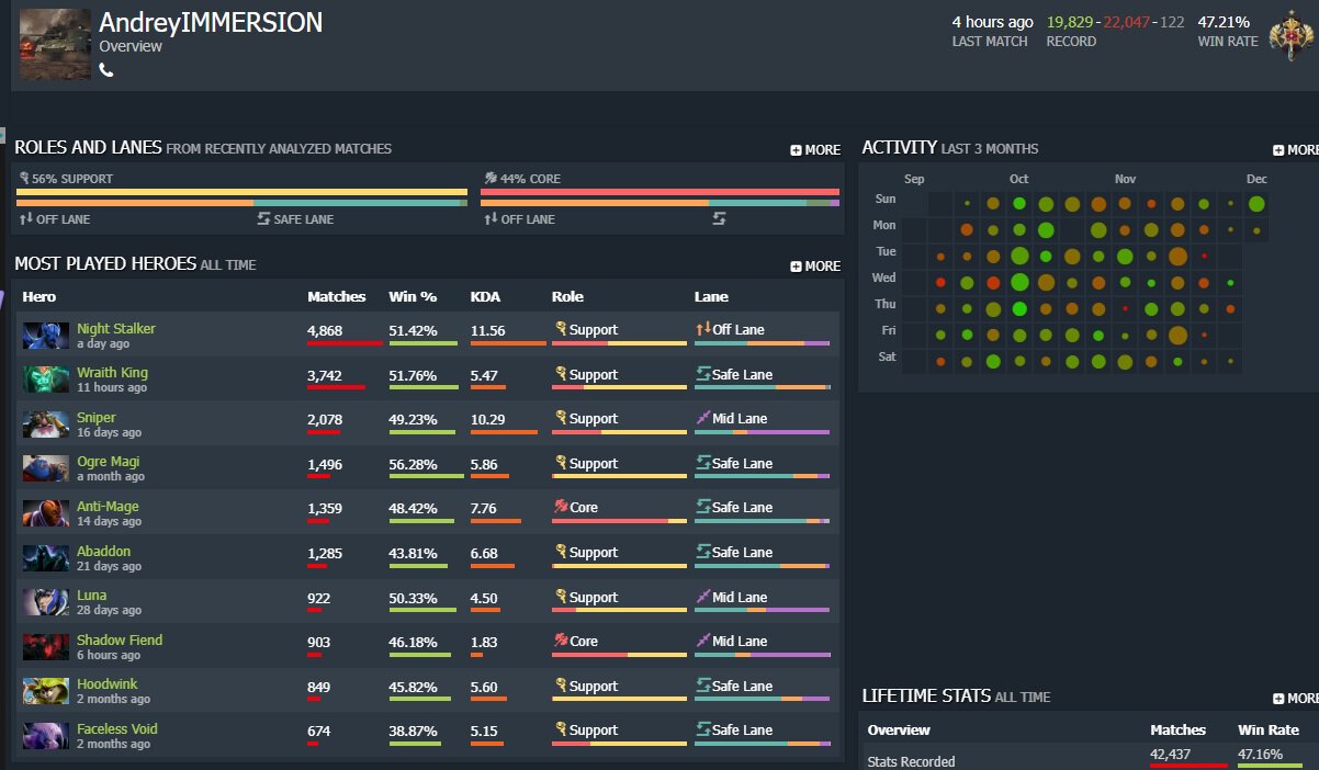 26,6 тысячи матчей Андрей Иммершен провел в рейтинговом режиме, 15,4 тысячи – в обычном. Любимыми героями Андрея остаются Night Stalker (4868 матчей, 51,42% побед) и Wraith King (3742 матча, 51,76% побед).