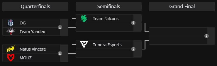 В плей-офф турнира прошли 6 коллективов – Falcons, Tundra, Team Yandex, OG, NAVI и Mouz.