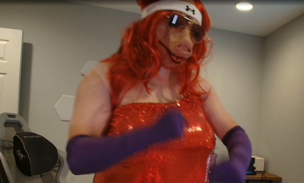Мэддисон закосплеил Бустера в женском платье, повязке и маске свиньи во время SLAY