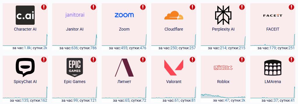 Пользователи жалуются на проблемы с доступом к многим сервисам, включая Character AI, Perplexity AI, Janitor AI, SpicyChat AI, Zoom, Epic Games, Faceit, и Valorant