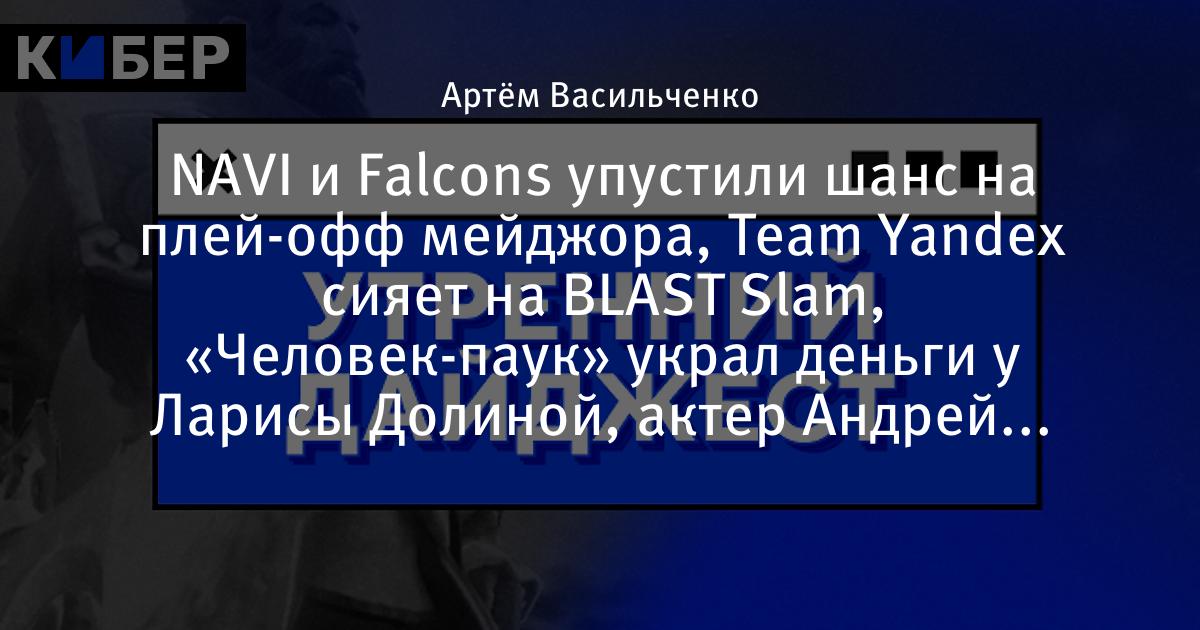 NAVI и Falcons упустили шанс на плей-офф мейджора, Team Yandex сияет на BLAST Slam, «Человек-паук» украл деньги у Ларисы Долиной, актер Андрей Гайдулян заценил борщ Кори и другие новости утра