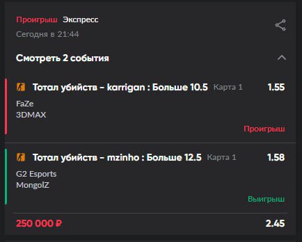 Магеррам «Mager» Ахмедов поставил 250 тысяч на экспресс из двух событий: тотал фрагов Аюша «Mzinho» Батболда больше 12,5 на первой карте с G2 и тотал фрагов Финна «Karrigan» Андерсена больше 10,5 на первой карте с 3DMax.