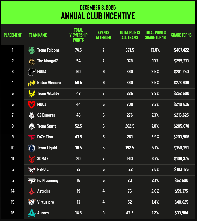 ESL подвела итоги первого сезона поощрительной системы Annual Club Incentive. Программа действовала в рамках турниров ESL в 2025 году, а призовой фонд составил 2,95 млн долларов.