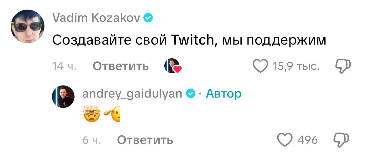 Вадим «Evelone» Козаков оставил комментарий под тиктоком Андрея Гайдуляна с предложением начать стримить. Актер ответил контент-мейкеру лайком.