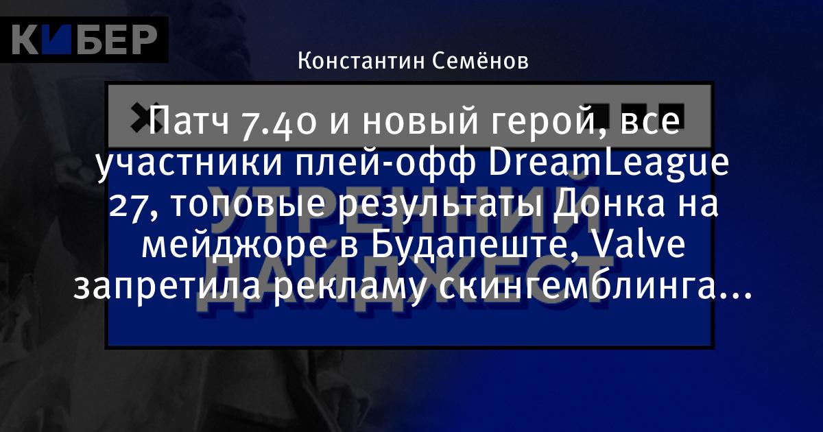 Патч 7.40 и новый герой, все участники плей-офф DreamLeague 27, топовые результаты Донка на мейджоре в Будапеште, Valve запретила рекламу скингемблинга на турнирах по CS 2 и другие новости утра
