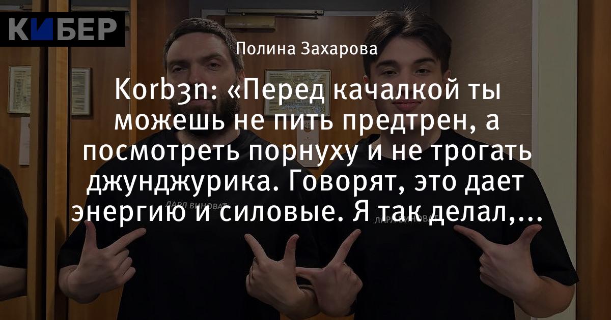 Korb3n: «Перед качалкой ты можешь не пить предтрен, а посмотреть порнуху и не трогать джунджурика. Говорят, это дает энергию и силовые. Я так делал, кстати»