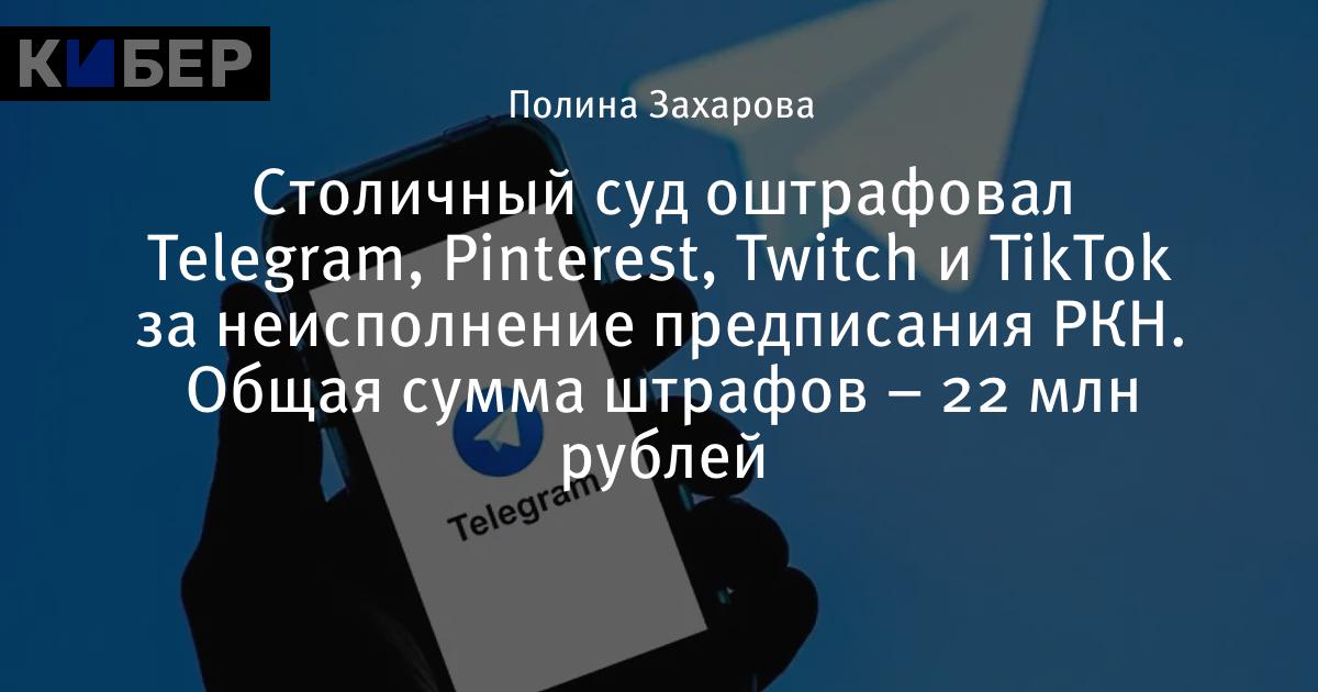 Столичный суд оштрафовал Telegram, Pinterest, Twitch и TikTok за неисполнение предписания РКН. Общая сумма штрафов – 22 млн рублей