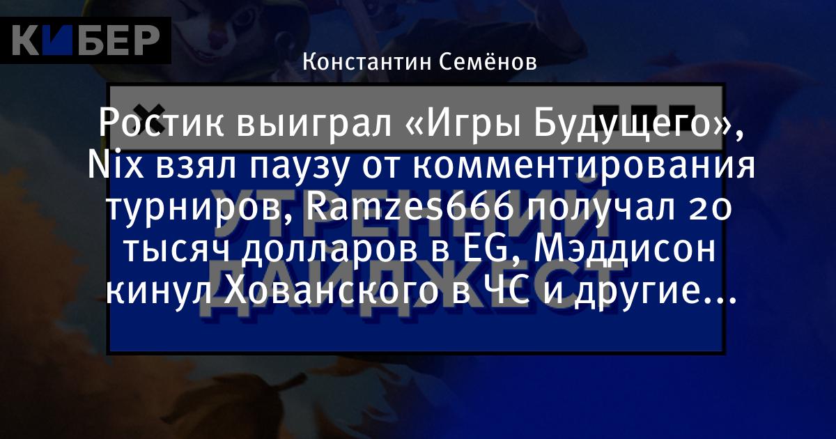 Ростик выиграл «Игры Будущего», Nix взял паузу от комментирования турниров, Ramzes666 получал 20 тысяч долларов в EG, Мэддисон кинул Хованского в ЧС и другие новости утра