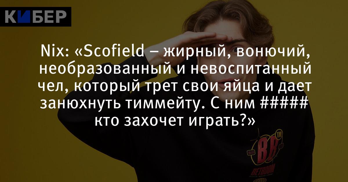 Scofield – жирный, вонючий, необразованный и невоспитанный чел, который трет свои яйца и дает занюхнуть тиммейту. Думаешь, с ним ##### [много] кто захочет играть?», – раскритиковал киберспортсмена Nix.