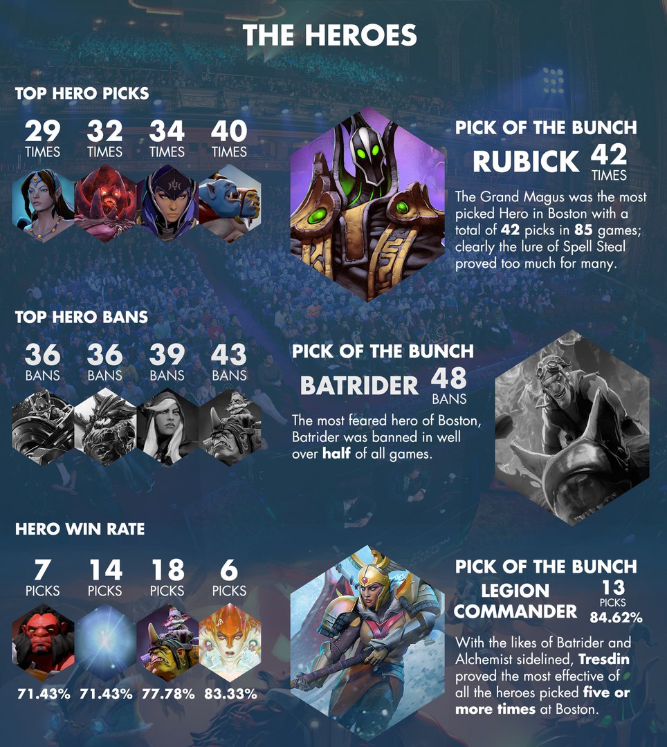 Занятная статистика героев. Rubick’а пикали чаще всего, а самый высокий win rate – у Legion Commander.