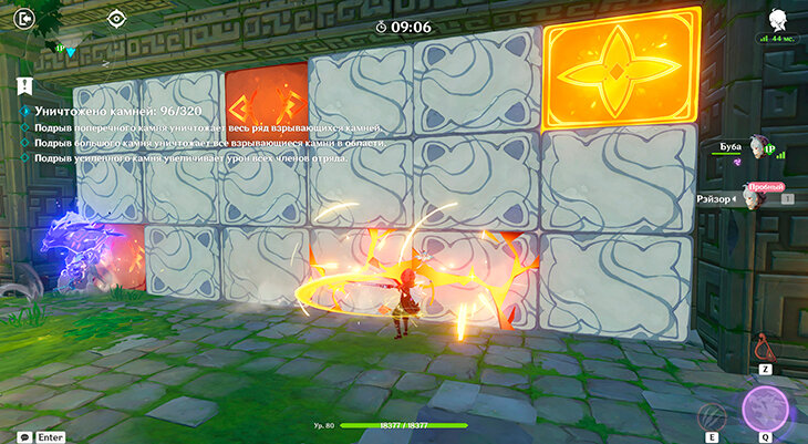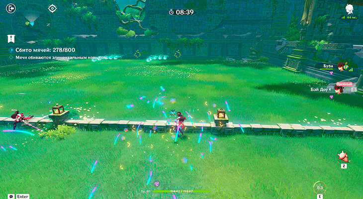 Вам дадут Бэй Доу, у нее двуручный меч. Когда мимо будут пролетать шары, нужно нажимать элементальный навык и ударять мечом по ним. Благодаря элементальному навыку рейнж удара Бэй Доу увеличится, и вы сможете разбить всю пачку одним ударом.