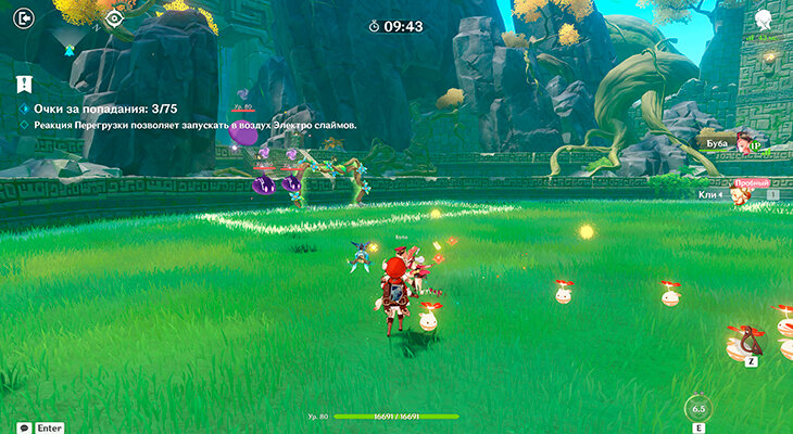 На арене расположены футбольные ворота, вам выдают Пиро-персонажа (Янь Фэй или Кли), нужно с помощью обычных атак забивать Электро-слаймов в ворота. За маленьких слаймов дают по одному очку, за больших – 5 очков. Всего нужно набрать 75.