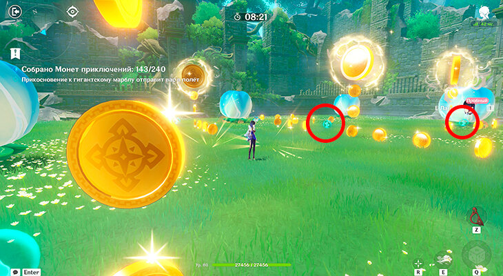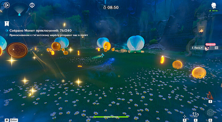 Вам дадут пробную Е Лань, с помощью ее элементального навыка нужно бегать по полю, уклоняясь от воздушных марблов. Всего нужно собрать 240 монет. За большие монеты дают 5 очков, за маленькие – по одному. Каждый раз, когда Е Лань сталкивается с марблом, ее отбрасывает в сторону, но здоровье не тратится.