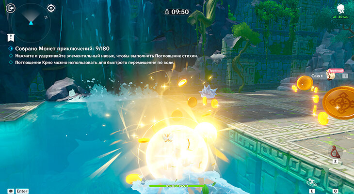Элементальный навык Саю позволяет ей катиться через препятствия. Зажмите и долго держите, ударьтесь о Крио слайм и отправляйтесь в воду – тогда Саю построит ледяную дорожку. Единственный совет – следите за выносливостью.