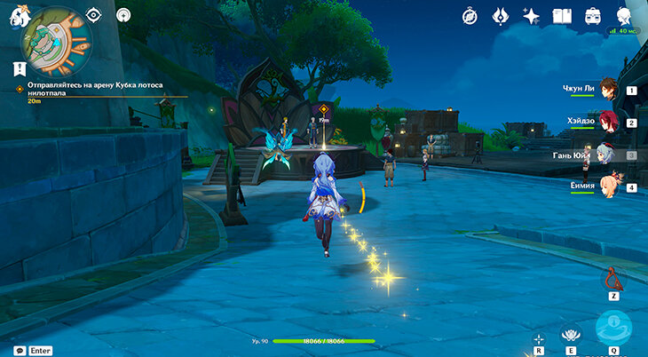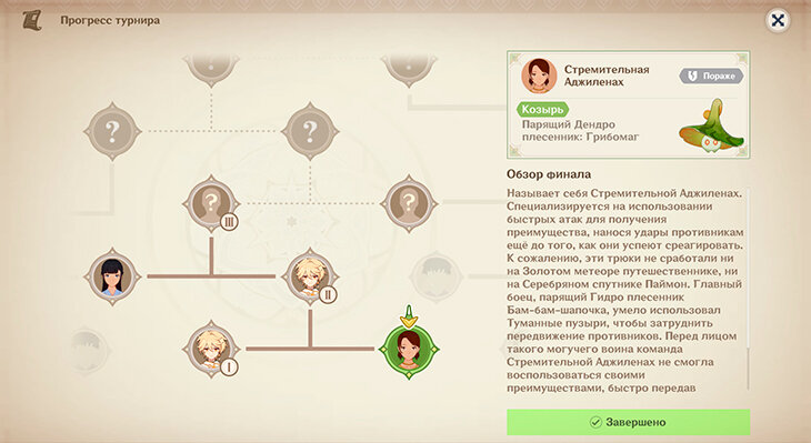 Пройдите задание «Первое сражение Кубка лотоса нилотпала», которое можно найти в меню заданий. Во время прохождения вы сразитесь со Стремительной Аджиленах. После победы поговорите с Яэ Мико и возвращайтесь на арену. Там будет висеть расписание следующих боев – подчиненной Мико не повезло столкнуться с Путешественником во втором раунде.