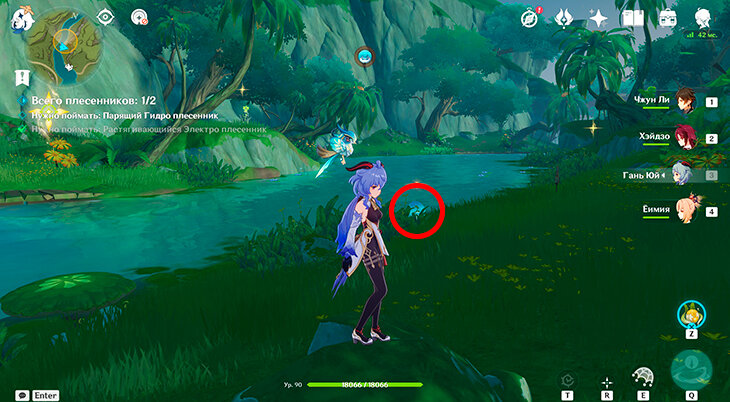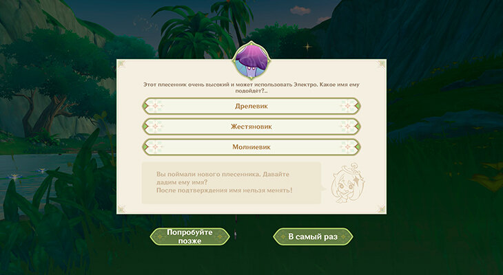Пора ловить будущих покемонов. В пригороде есть зона, где обитают два относительно мирных плесенника, которых легко поймать. Нельзя подходить к ним вплотную. В целом, жемчужина мудрости работает по принципу сети вездесущности – после экипировки нажмите Е или аналогичную кнопку на телефоне или геймпаде, чтобы экипировать жемчужину вместо элементального навыка, а потом зажмите, чтобы прицелиться, и отпустите кнопку, чтобы поймать. Кнопку атаки (ЛКМ) жать не надо. Таким образом нужно поймать двух плесенников.