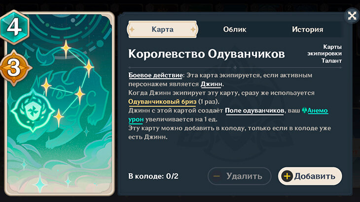«Изумрудная тень»: когда персонаж использует навык или экипирует талант, расходуется на 1 Анемо дайс меньше (один раз за раунд). На фазе броска два из брошенных дайсов гарантированно будут Анемо.