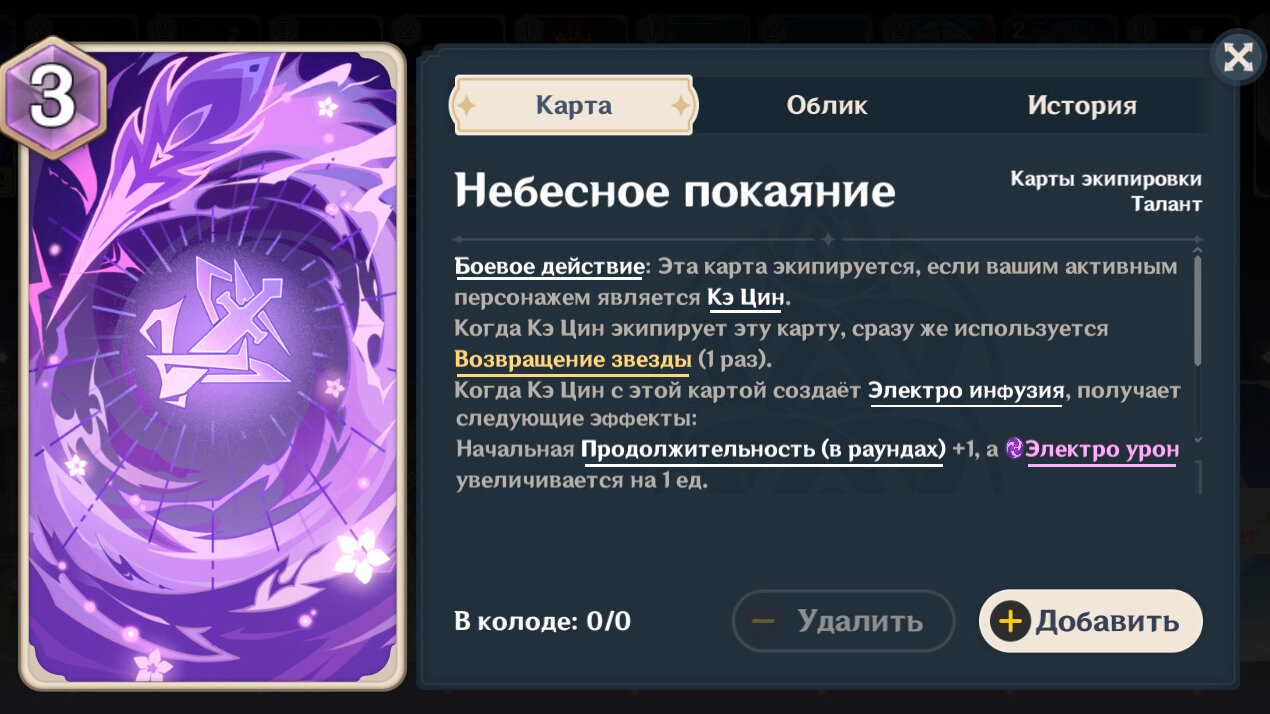 «Церемониальный меч», 3 дайса: персонаж наносит на 1 урона больше. При использовании элементального навыка создается 1 дайс, соответствующий элементу персонажа (один раз за раунд).
