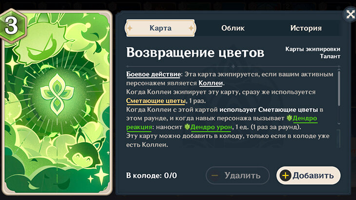 «Воспоминания дремучего леса»: когда персонаж использует навык или экипирует талант, расходуется на 1 Дендро дайс меньше (один раз за раунд). На фазе броска два из брошенных дайсов гарантированно будут Дендро.