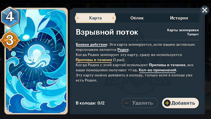 - Обычная атака: наносит 1 Гидро урона, стоит 1 Гидро дайс и 2 других.