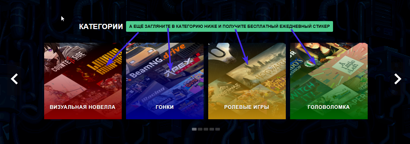 - На главной странице магазина вы увидите баннер с текстом «А еще загляните в категорию ниже и получите бесплатный ежедневный стикер»