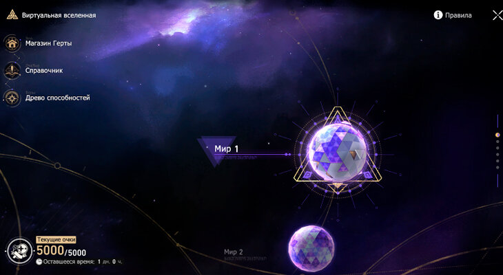 Зайдите в Виртуальную вселенную в кабинете Герты и активируйте ее. Выберите Мир 1.
