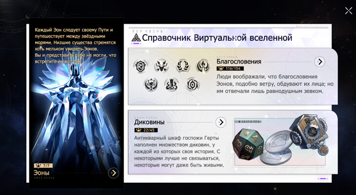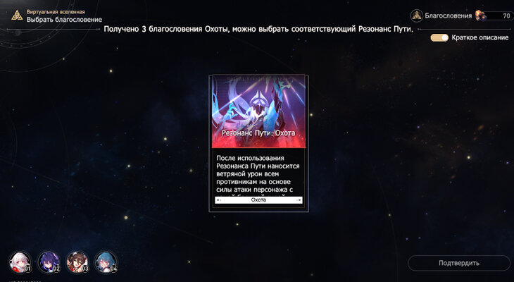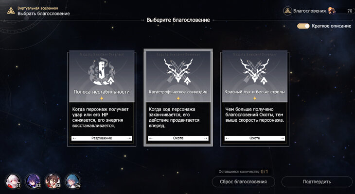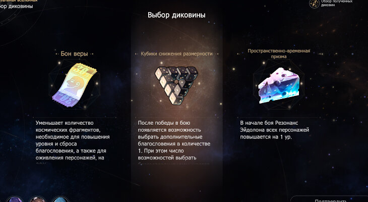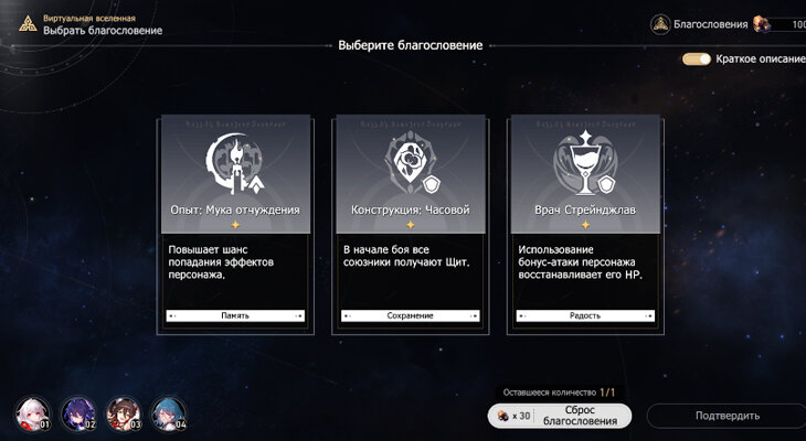 Не переживайте, вы можете просто выбрать подходящее вам по описанию благословение, но можете и сбросить его за 30 космических фрагментов. С момента погружения в Мир вам доступно 100 фрагментов. Это валюта Виртуальной вселенной, за которую можно улучшать благословения, тратить в случайных событиях и так далее.