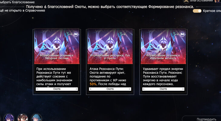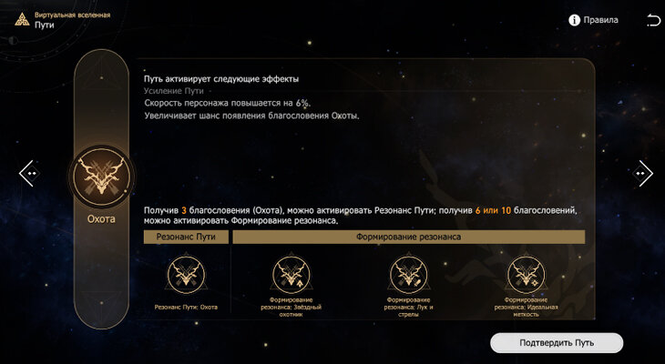 В этом прохождении мы выбрали резонанс пути Охота. Выбор пути дает бонусы к характеристикам и увеличение шанса выпадения Благословений выбранного Пути.