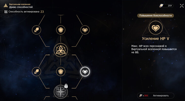 Оно открывается в Мире 2, это путь усиления умений для всех загружаемых в Виртуальную Вселенную отрядов. Оно дает усиления, действующие в каждом забеге Виртуальной Вселенной, и не сбрасывается, как временные баффы во время забега. Прокачивается очками способностей, которые даются за прохождение и перепрохождение Миров.
