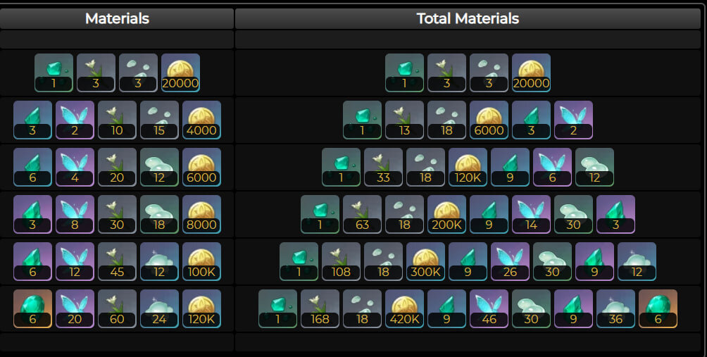 Для прокачки Венти по уровням понадобятся сесилии, слизь/выделения/концентрат слаймов, семя урагана, бирюза Вайюда различной редкости. По уровням: