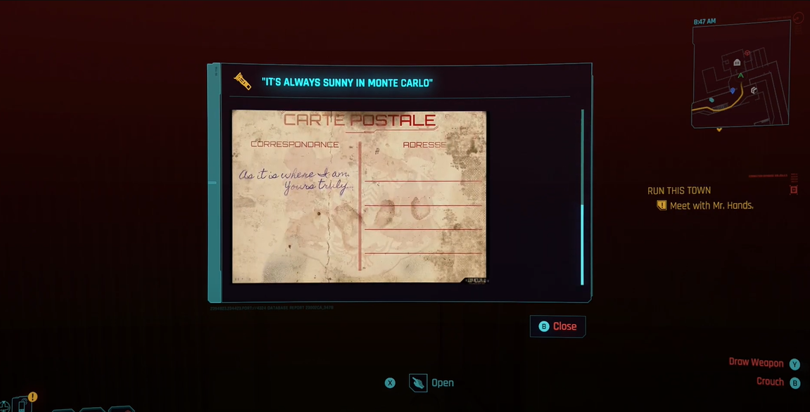 Позже, когда вы вернетесь в свою квартиру в Мегабашне H10, вы найдете открытку от Алекс, в которой она сообщает, что уехала из Найт Сити в Монте-Карло.