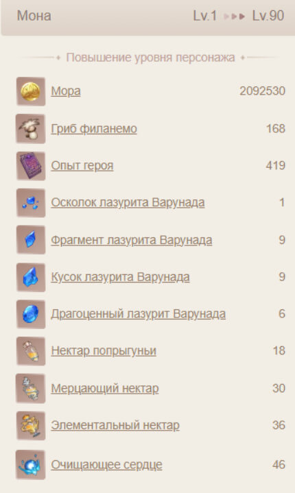 - 60: 3 куска лазурита Варунада, 8 очищающих сердец, 30 грибов филанемо, 18 мерцающих нектаров, 80 000 моры;