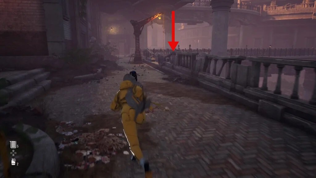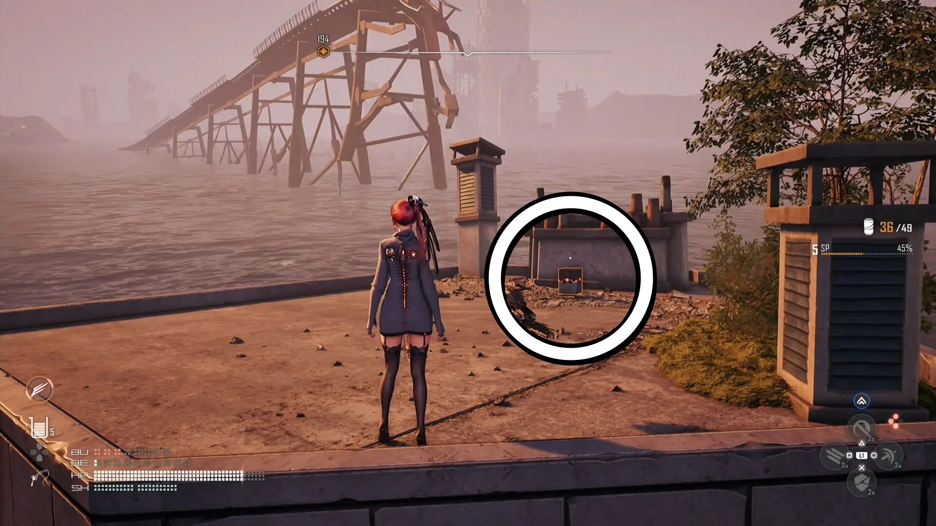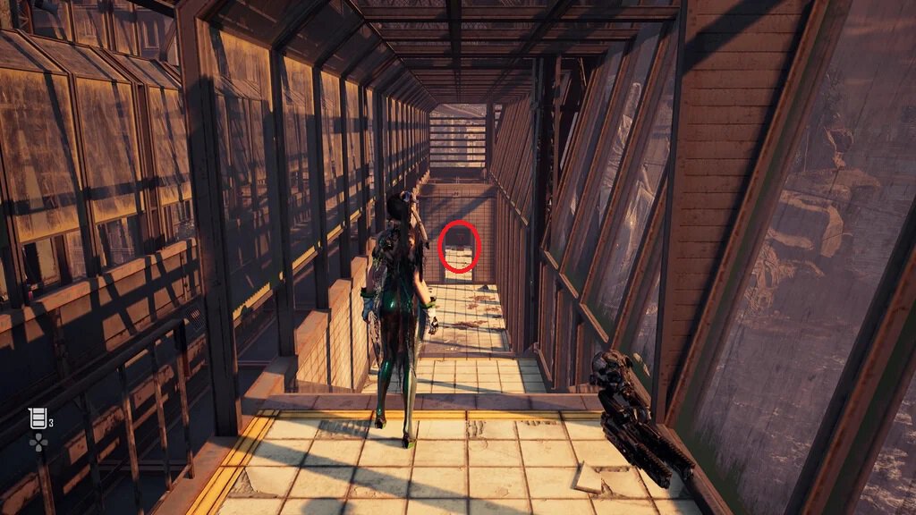 В локации «Эйдос 9» будет автостоянка. Слева от нее есть выступы, ведущие вниз, – они приведут к сундуку.